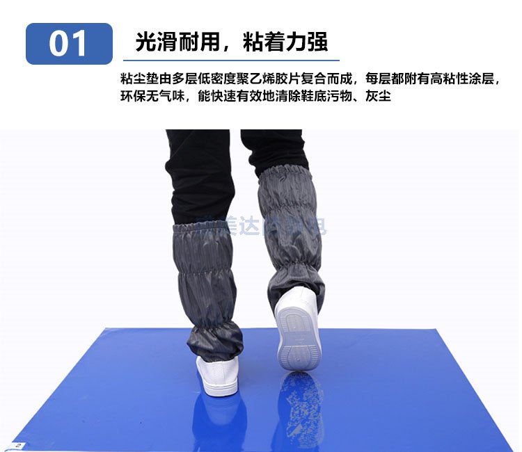 粘塵墊又稱粘塵地墊、粘塵地板膠,采用優(yōu)質(zhì)低密度聚乙烯材料和環(huán)保型壓敏水溶性粘合劑經(jīng)過(guò)特殊工藝復(fù)合而成,能使粘塵墊每層表面粘性均勻,不掉膠,無(wú)氣味,環(huán)保無(wú)毒。粘塵墊主要適用于貼放在無(wú)塵潔凈空間的入口處及緩沖區(qū)間,它能有效地粘除鞋底和車輪上的灰塵,最大限度的減少塵埃對(duì)潔凈環(huán)境質(zhì)量的影響,從而達(dá)到簡(jiǎn)易除塵的效果,是無(wú)塵潔凈車間除塵的重要方式之一。產(chǎn)品廣泛應(yīng)用于微電子、半導(dǎo)體、生物制藥,醫(yī)療器械、食品加工和醫(yī)院等各行業(yè)。