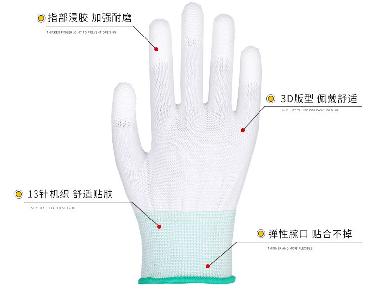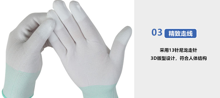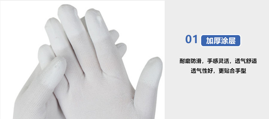 PU涂層手套又稱PU涂膠手套,根據(jù)涂膠的部位分為PU涂指手套、PU涂掌手套。其制作方法是在針織尼龍手套的手指或手掌部位涂上一層PU樹脂,這樣既增加了防滑性能,又增加了隔熱性能,同時能防止人體手掌的手汗和微粒污染,是精密電子生產(chǎn)線不可缺少的產(chǎn)品??捎糜诰ぶ圃鞓I(yè)、紡織業(yè)、電子行業(yè)、電力工程、汽車裝配、無塵車間等領域。