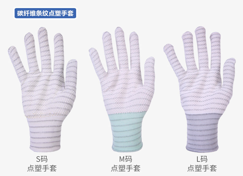 碳纖維點塑手套又稱碳纖維點塑防滑手套,其制作方法是在針織尼龍手套的整個手指和手掌部位涂上一層PU點塑樹脂,這樣既增加了防滑性能,又增加了隔熱性能,同時能防止人體手掌的手汗和微粒污染,是精密電子生產(chǎn)線不可缺少的產(chǎn)品??捎糜诰ぶ圃鞓I(yè)、紡織業(yè)、電子行業(yè)、電力工程、汽車裝配、無塵車間等領(lǐng)域。