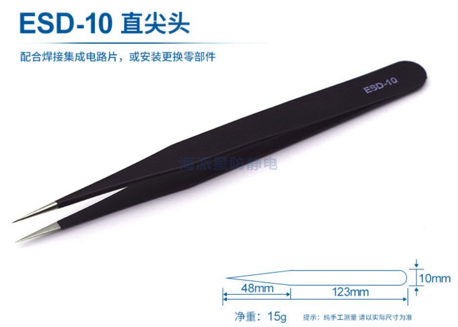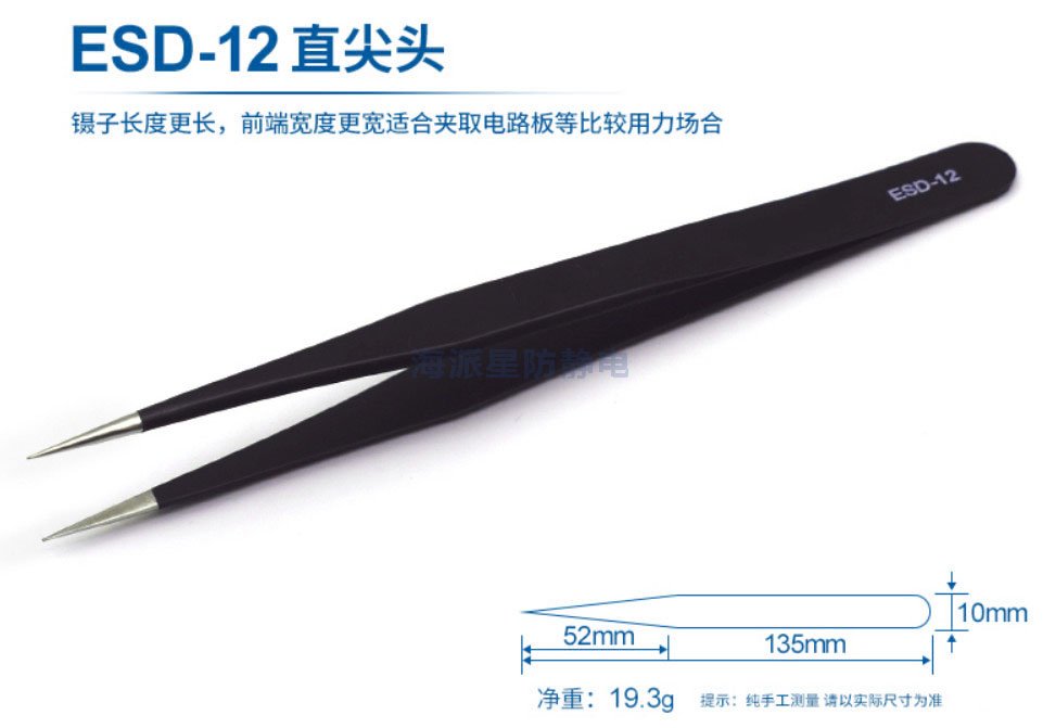 ESD-12 鑷子長(zhǎng)度更長(zhǎng),前端寬度更寬,適合夾取電路板等比較用力場(chǎng)合