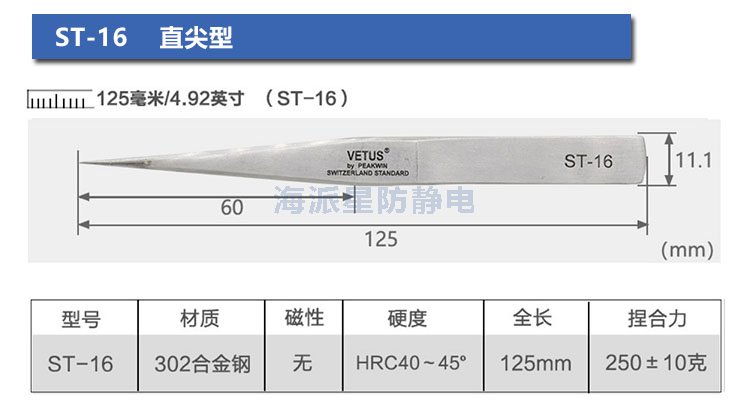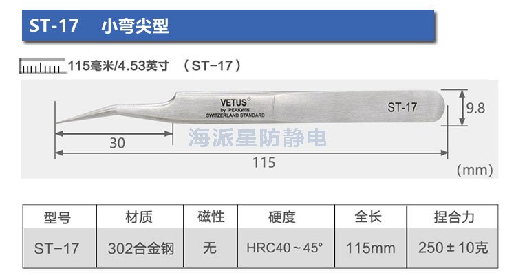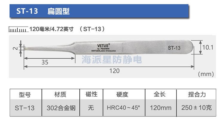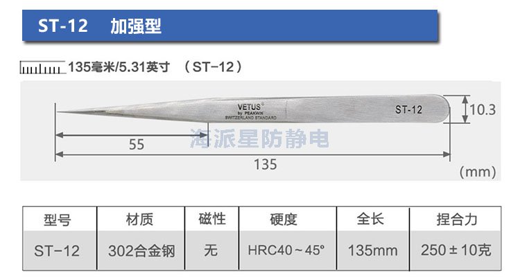 | ST-12 | 鑷子長(zhǎng)度更長(zhǎng),前端寬度更寬,適合夾取電路板等比較用力場(chǎng)合 | ||||||