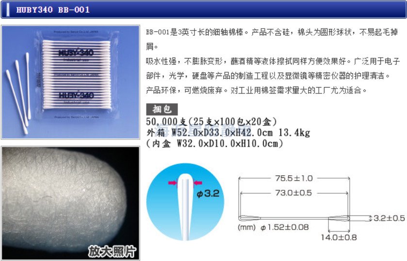 | 日本HUBY | BB-001 | 3寸 | 25只/包,100包/盒,20盒/箱 | 3"雙頭棉簽、圓頭,白色紙桿 |