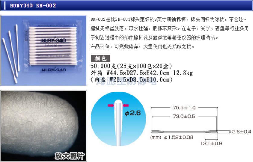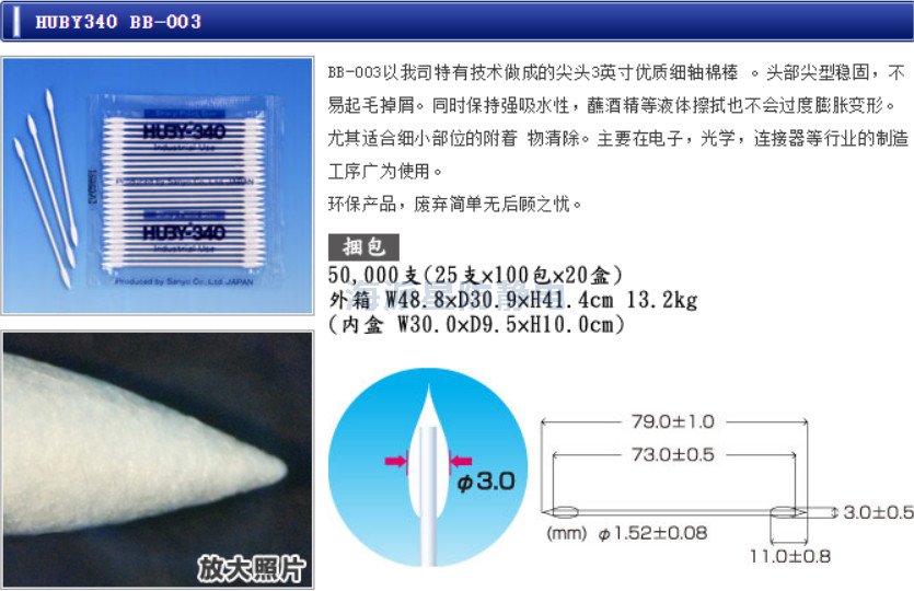 HUBY-340系列凈化棉簽,是由世界棉簽生產(chǎn)廠商—日本SANYO公司生產(chǎn),所有型號(hào)棉簽均選用長(zhǎng)絲棉,用于各行業(yè)精密產(chǎn)品的擦拭、清潔??稍谏a(chǎn)過(guò)程的特殊環(huán)境中(擦拭布無(wú)法擦拭)消除污染物和保持清潔。擦拭后化學(xué)殘留物含量低。可燃,易處理,對(duì)環(huán)境環(huán)保。廣泛應(yīng)用于激光及相關(guān)工業(yè),半導(dǎo)體及相關(guān)產(chǎn)業(yè),光學(xué),電子顯微鏡,磁讀寫(xiě)頭的清洗,視頻頭,磁頭的清洗,精密器件等。