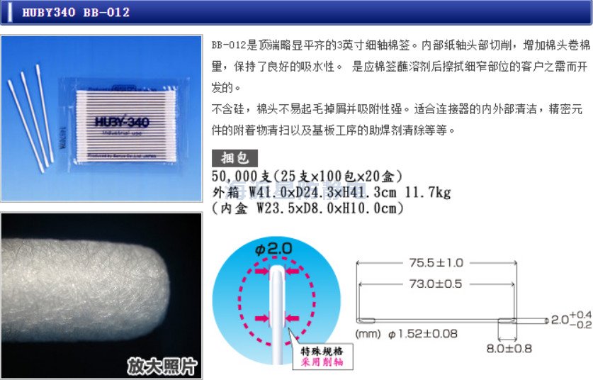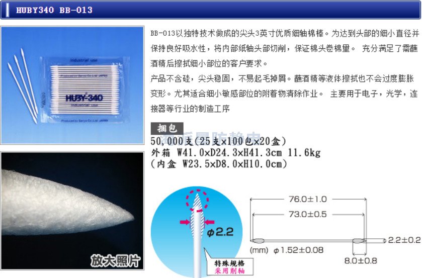 | 日本HUBY | BB-013 | 3寸 | 25只/包,100包/盒,20盒/箱 | 3"雙頭棉簽、細(xì)、硬質(zhì)尖頭,白色紙桿 |