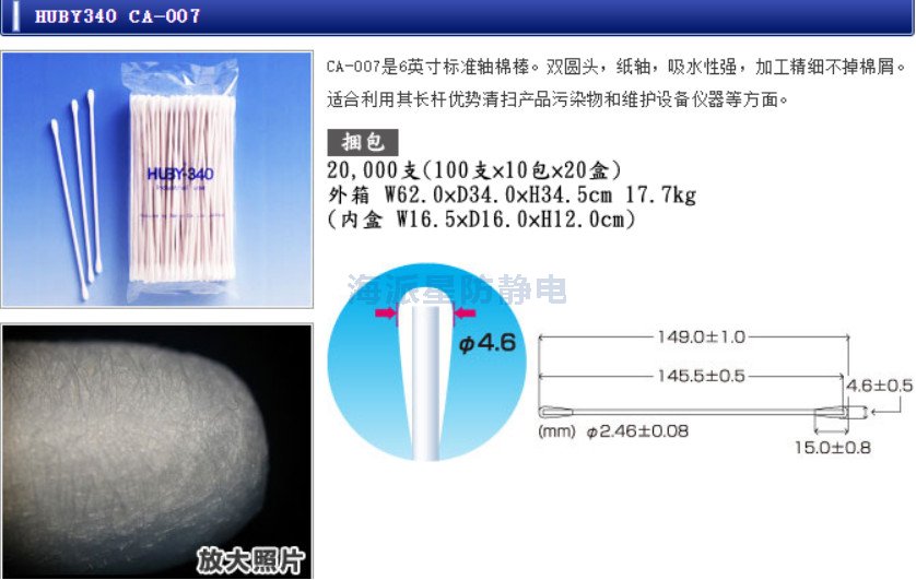 | 日本HUBY | CA-007 | 6寸 | 100只/包,10包/盒,20盒/箱 | 6"雙頭棉簽、圓頭,白色紙桿 |