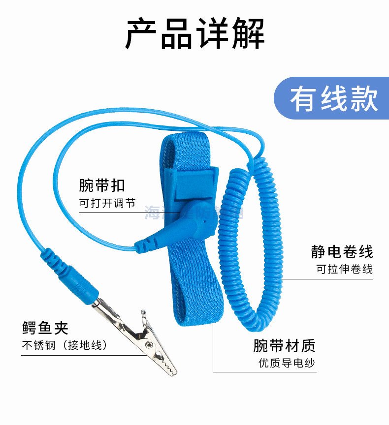 防靜電手腕帶,也叫防靜電手環(huán),是一種配戴于人體手腕上,泄放人體聚積靜電電荷的器件。它分為有線型、無線型,有金屬環(huán)和橡筋導(dǎo)電絲混編環(huán)。它由防靜電松緊帶、活動按扣、彈簧軟線、保護(hù)電阻及夾頭組成,松緊帶的內(nèi)層用防靜電紗線編織,外層用普通紗線編織,可有效保護(hù)零阻件,免于受靜電之干擾,用以泄放人體的靜電。