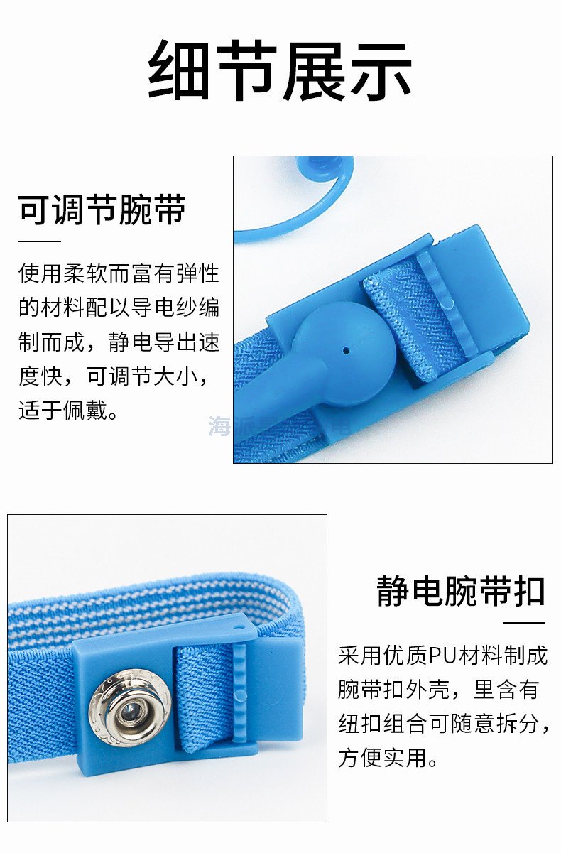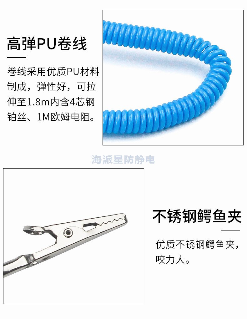 1、產(chǎn)品材質(zhì):PU帶+彈性尼龍絲+導(dǎo)電絲編織+不銹鋼活動夾